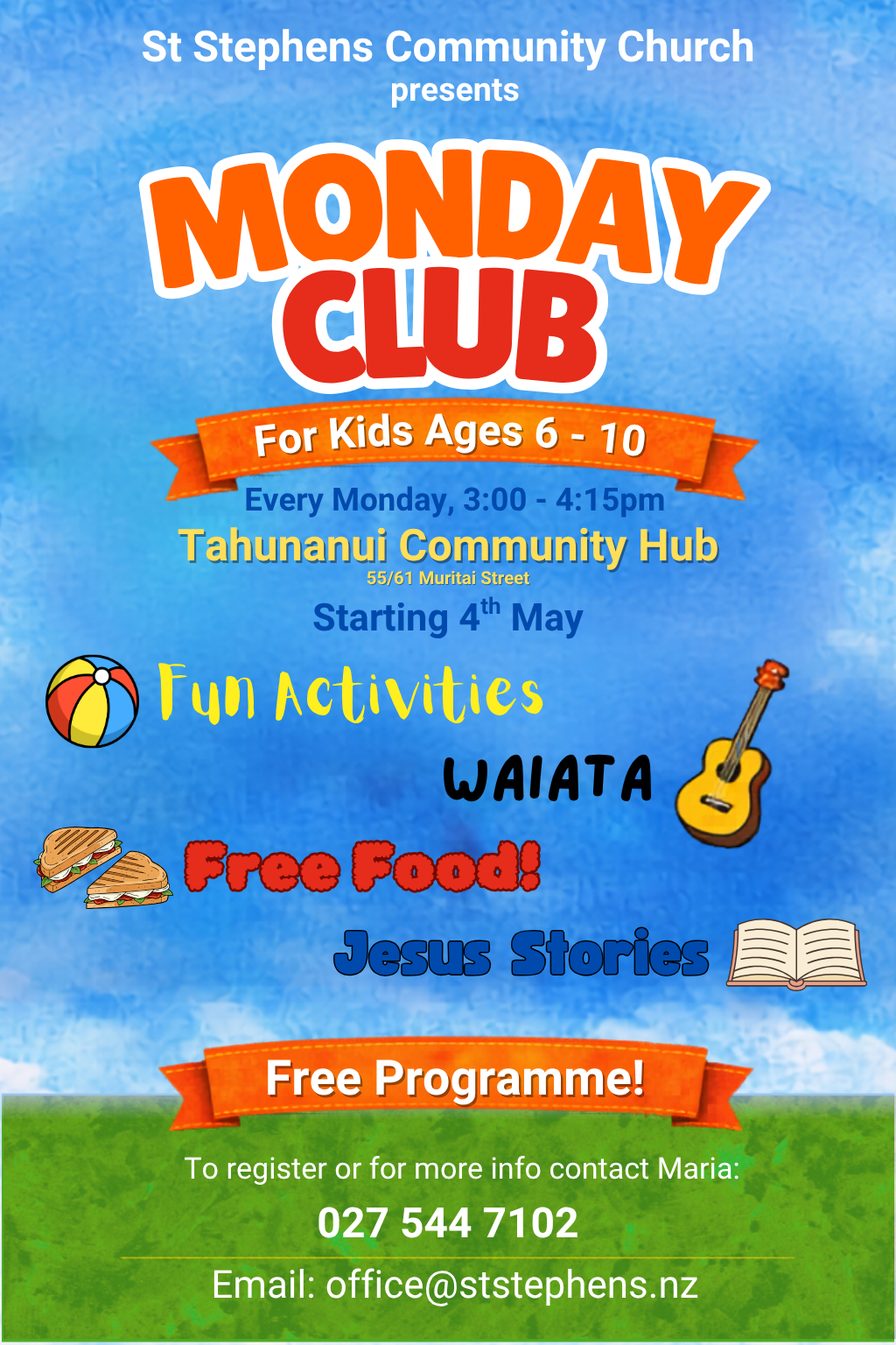 St Stephens Community Church warmly invites children aged 6–10 to join our exciting Monday Club at the Tahunanui Community Hub! Running every Monday from 3:00pm to 4:15pm, starting 4th May, this free programme is packed with fun activities, music (waiata), engaging Jesus stories, and of course—free food!