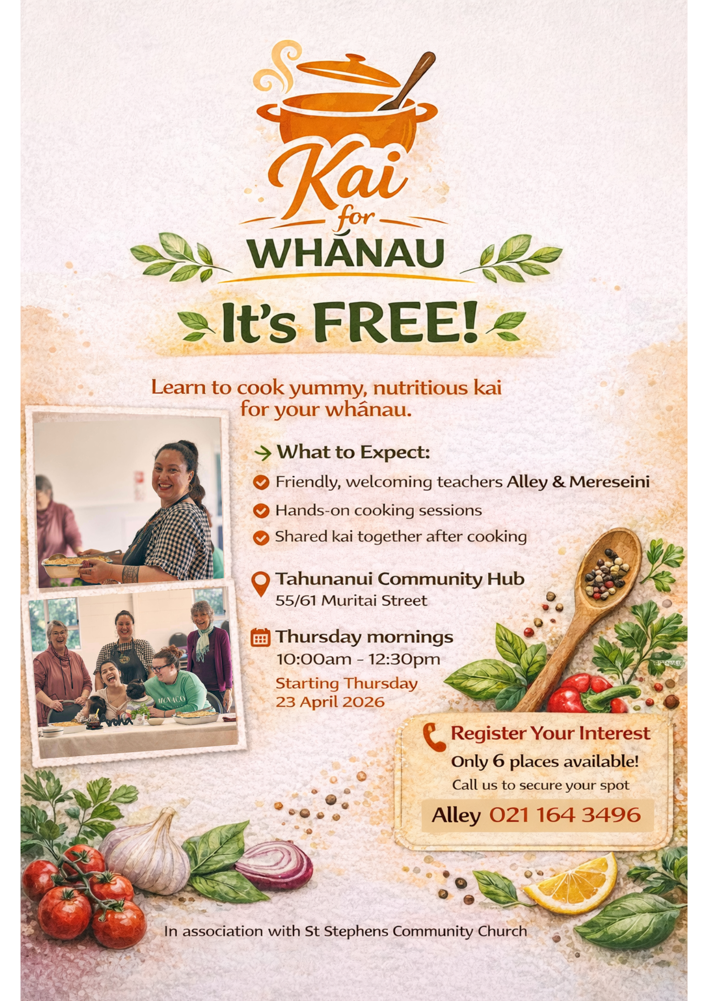Led by friendly tutors Alley and Mereseini, each session includes practical cooking, learning together, and enjoying a shared meal.